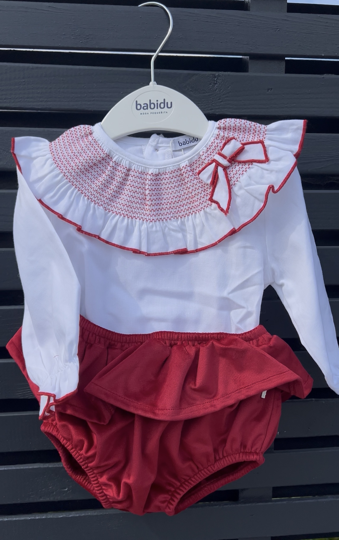 Babidu Smock White Blouse & Red Velvet Bloomers